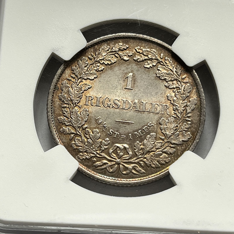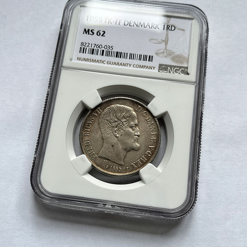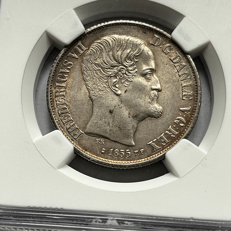 Denmark Rigsdaler 1855 slabbed MS62, FK-FF.