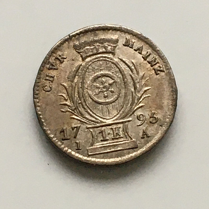 German states Mainz Kreuzer 1795 AEF, very light slight patchy toning.