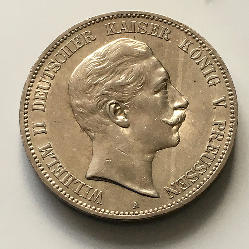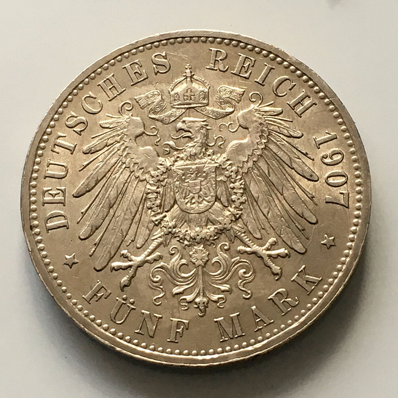 German states Prussia 5 Marks 1907 GEF, slight streaky toning on OBV, slight contact marks.