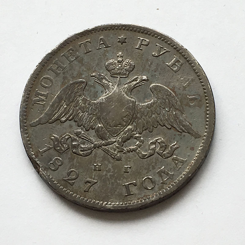Russia Rouble 1827 VF, Slight edge knocks on OBV and dark attractive toning.