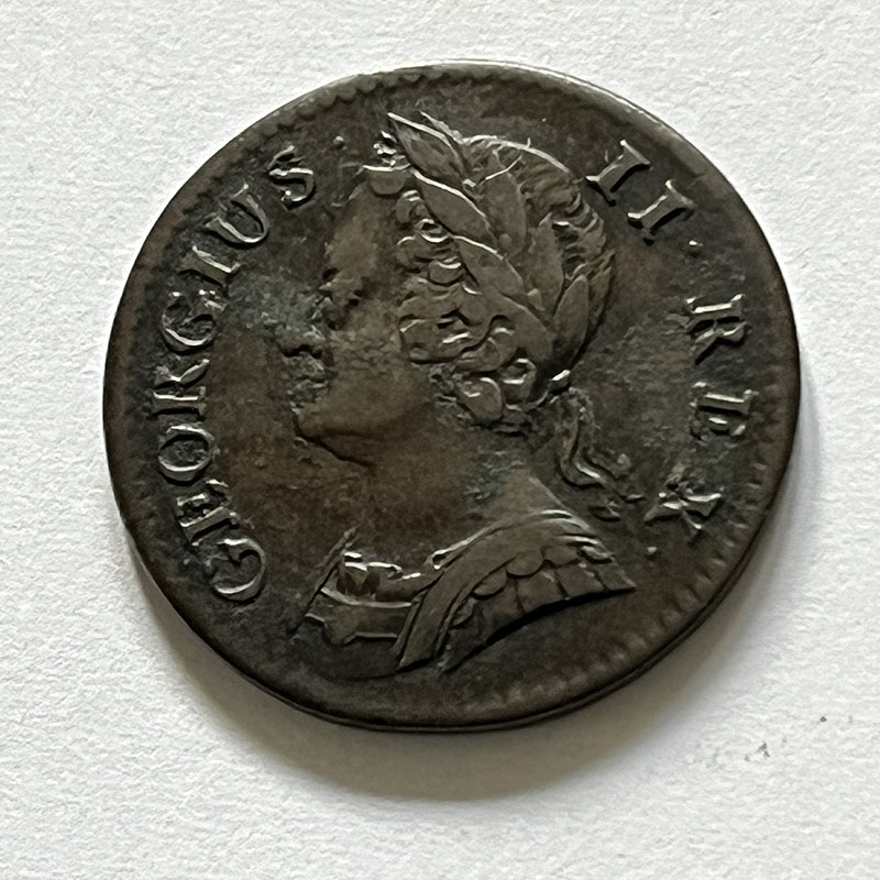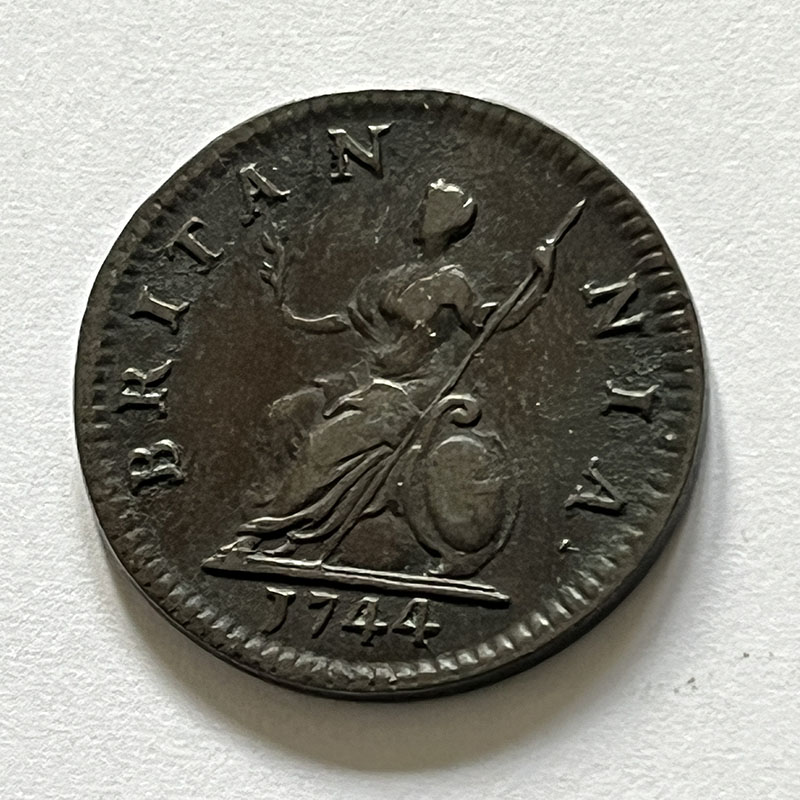 George II Farthing 1744 GVF+, patches of pitting on OBV.