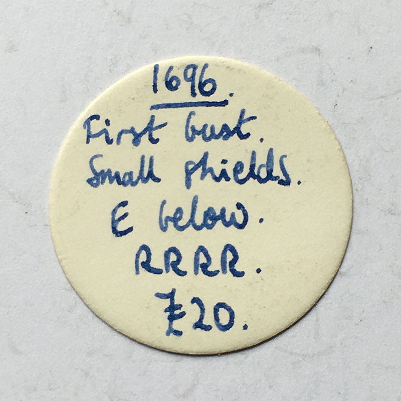 William III Halfcrown 1696 E below VG, 1st bust small shields ESC537 Extremely rare. Comes with old collectors ticket from 1977.