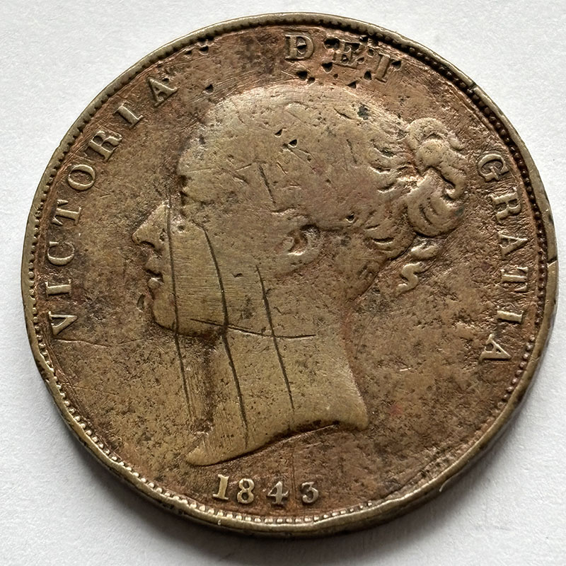 Victoria Penny 1843 GF, colon, scratches on OBV.