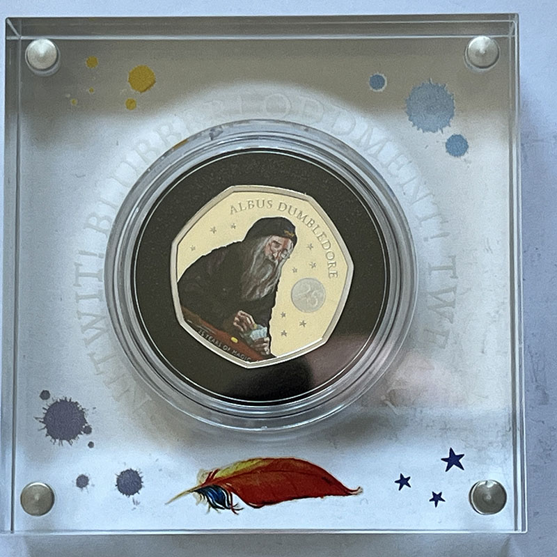 Charles III Fifty Pence 2023 Silver Proof, Harry Potter Professor Dumbledore, with certificate of authenticity and royal mint original case.